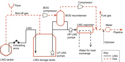 LNG trong bể chứa được dẫn động bằng áp suất tới thiết bị khí hóa ở nhiệt độ không khí, thiết bị này được cung cấp cho người sử dụng sau khi khí hóa. Khi LNG thoát ra khỏi bể, áp suất sẽ liên tục giảm và tốc độ sẽ giảm dần cho đến khi dừng lại.