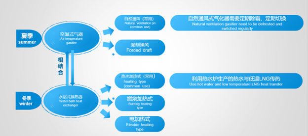 Bể chứa chất lỏng được điều áp bằng bộ tăng áp của bể chứa. Khi áp suất của bể chứa chất lỏng lớn hơn áp suất ra ngoài 0.2 Mpa, LNG được vận chuyển đến thiết bị khí hóa nhiệt độ không khí bằng đường ống nhờ chênh lệch áp suất