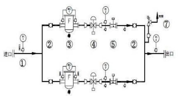 Sau khi khí hóa, LNG đi vào phần đo điều chỉnh áp suất, đầu tiên được lọc bằng bộ lọc, sau đó điều chỉnh áp suất đến mức áp suất trung bình thông qua bộ điều chỉnh điện áp, được đo bằng lưu lượng kế tuabin và cuối cùng được khử mùi.